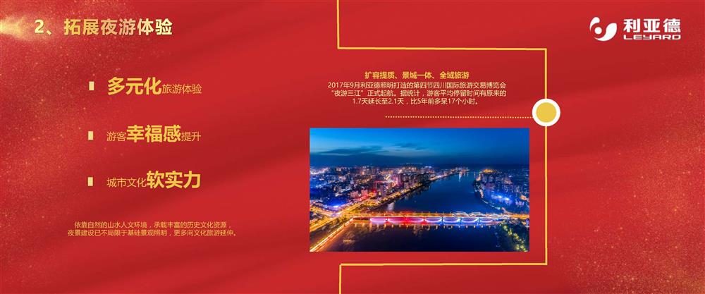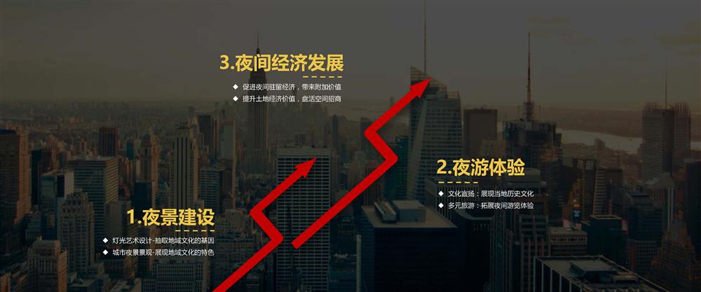 25 12 2019 來源: 照明板塊適用方向: 1、城市夜景建設(shè):燈光藝術(shù)設(shè)計(jì)-抽取地域文化的基因;城市夜景景觀-展現(xiàn)地域文化的特色! 2、拓展夜游體驗(yàn):文化宣揚(yáng)-展現(xiàn)當(dāng)?shù)貧v史文化;多元旅游-拓展夜間游覽體驗(yàn)! 3、促進(jìn)夜間經(jīng)濟(jì)發(fā)展:促進(jìn)夜間駐留經(jīng)濟(jì),帶來附加價(jià)值;提升土地經(jīng)濟(jì)價(jià)值,盤活空間招商!